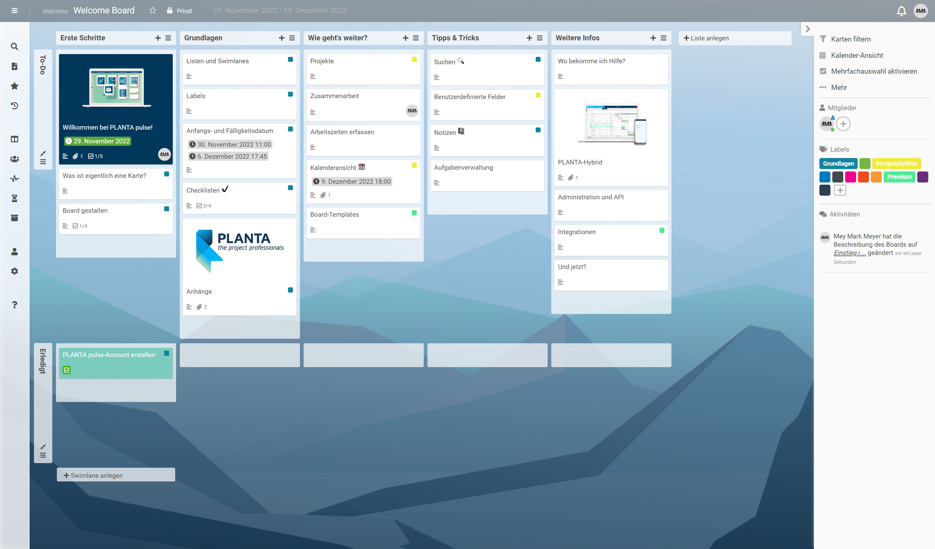 Beim Neueinstieg präsentiert PLANTA pulse ein Willkommens-Board (Bild 4), auf dem bereits etliche Aufgabenkärtchen mit Erklärungen zum Programm erfasst sind. Beim Durchklicken bekommt man so einen ersten Eindruck der Bedienung sowie etliche Informationen zur Software. Schon das kann für den Einstieg reichen – mehr als eine kurze Einweisung braucht das Team in keinem Fall.