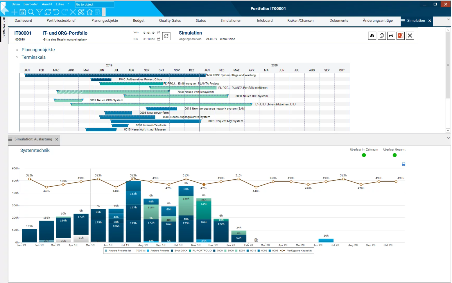PLANTA project liefert für diese Aufgabe bereits viele Instrumente, wie z.B. Bewertungsfunktionen, Ressourcenübersichten und grafische Auswertungen. Für tiefgehende Analysen kommt mit PLANTA portfolio der dritte Baustein ins Spiel, der es ermöglicht, die laufenden Projekte ebenso wie Projektideen oder sonstige mögliche zukünftige Projekte in Simulationen zu kombinieren (Bild 8). Dabei verschiebt man zum Beispiel ganze Projekte oder bricht laufende Projekte ab, um stattdessen neue Projektideen in das Portfolio aufzunehmen. Die Auswirkungen auf den Personal- oder Finanzbedarf zeigt die Software erst einmal auf, ohne dass dafür schon echte Änderungen an den Detailplanungen der einzelnen Vorhaben nötig wären.