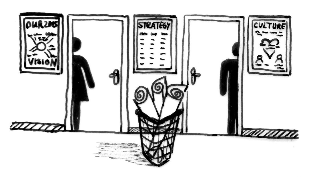 Haben Sie das schon mal erlebt? Die Geschäftsführung tritt vor die Mitarbeiter und berichtet davon, dass sie eines der Top 5 Beratungshäuser engagiert haben, um aufzuzeigen, wie die Zukunft des Unternehmens aussehen muss. Nun wird alles anders – es braucht neue Produkte und eine neue Kultur. Die Berater haben ein Dossier aus 450 PowerPoint Folien erstellt, in dem alles steht. Ab heute hängen die neuen Poster zur neuen Vision und zur neuen Unternehmenskultur in den Fluren. Helfen Sie mit, dass es erfolgreich wird!