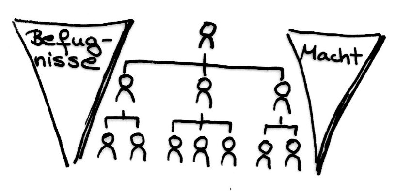 Eigentlich ist aber gar nicht das Organigramm entscheidend, sondern das Verteilungsschema der Befugnisse. In klassischen Organigrammen werden die formalen Befugnisse von den oberen Ebenen in Richtung der unteren Ebenen verwaltet. Linien-, Prozess- und Projekt-Organisationen arbeiten mit starren und fixierten Verteilungsschemata, die bis zur nächsten formalen Reorganisation bestehen bleiben. Die Rollen nahe der Spitze haben die meisten Befugnisse; diejenigen, die niemanden mehr unter sich haben, haben die geringsten Befugnisse.