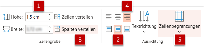 Wenn Sie in PowerPoint eine Tabelle einfügen, werden die Daten zunächst in jeder Zelle rechts oben angeordnet. Das ist die Standardeinstellung. Beim Vergrößern der Zeilenhöhe und beim Eingeben von Zahlen sieht das jedoch wenig professionell aus. Dies korrigieren Sie mit den in Bild 4 gezeigten Befehlen auf der Registerkarte Layout (in älteren Versionen noch Tabellentools/Layout).
