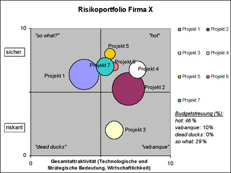 Um die Projekte aus dem Attraktivitätsportfolio in einer Risikobewertung abzubilden, ermittelt man aus den Werten der wirtschaftlichen und strategischen Attraktivität eines Projekts die Gesamtattraktivität. Im einfachsten Fall wird der Mittelwert der beiden Werte gebildet. So erhält z.B. ein Projekt mit den Koordinaten x=5 und y=7 in der Gesamtattraktivität eine 6. Steht der wirtschaftliche Nutzen der Projekte im Vordergrund, sollte dies durch eine entsprechende Gewichtung abgebildet werden (z.B. doppeltes Gewicht der wirtschaftlichen Attraktivität). Das würde im vorigen Beispiel den Wert (5+5+7)/3 = 5,66 ergeben. Der Wert der Gesamtattraktivität wird im Risikoportfolio auf der x-Achse abgetragen, die "Sicherheit" auf der y-Achse. Bild 1 zeigt beispielhaft das Risikoportfolio eines mittelständischen Unternehmens. Die darin dargestellte Sichtweise stammt aus der Bewertung von Forschungs- und Entwicklungsprojekten (nach Arthur D. Little, F&E-Projektportfolio).