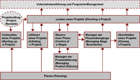 Die Prozesse und Managementkomponenten sind bei PRINCE2 unabhängig von Branchen und Projekttypen definiert. Das Prozessmodell in Bild 2 beschreibt die Schnittstelle zwischen Unternehmensführung und Projektmanagement. Die Anwender haben weit gehend freie Hand, welche Detailprozesse und Methoden sie einsetzen wollen. PRINCE2 gibt nur den übergeordneten Handlungs- und Entscheidungsrahmen vor und befasst sich nicht mit Detailprozessen, wie sie z.B. im PMBOK Guide des Project Management Institutes (PMI) behandelt werden.