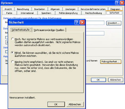 Bild 2: Klicken Sie anschließend im Registerblatt "Sicherheit" auf den Button "Makrosicherheit" und wählen Sie dort die mittlere Sicherheitsstufe.