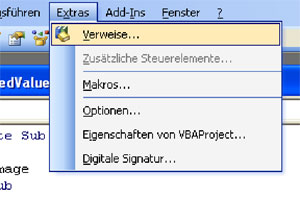 - Wechseln Sie jetzt mit der Tastenkombination ALT+F11 in den Makro Editor und wählen Sie dort im Menu "Extras" den Eintrag "Verweise" aus (Bild 4).