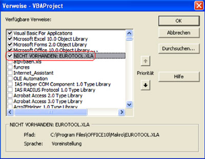 - Entfernen Sie das Häkchen in der Auswahlbox bei allen Bibliotheken die mit "Nicht vorhanden" gekennzeichnet sind. In diesem Beispiel ist es die Bibliothek "Eurotool.xla" (Bild 5).