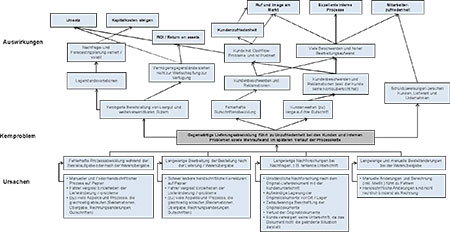 Ein großer Getränkevertrieb möchte die Auslieferung beim Kunden vor Ort schneller und effizienter abwickeln. Grund hierfür ist, dass die Kunden häufig unzufrieden sind, da die Prozesse bei der Lieferungsabwicklung nicht reibungslos funktionieren. Zusätzlich entsteht dadurch in der Nachbearbeitung häufig ein hoher Mehraufwand. Aus diesem Grund werden in einem Workshop die Ursachen und Auswirkungen zu diesem Problem gesammelt und analysiert.