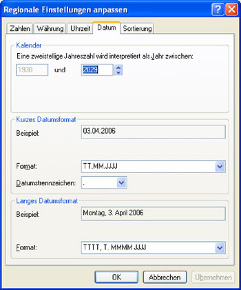 Die Grenze zwischen historischem und zukünftigem Datum zieht nicht Excel selbst, sondern eine Einstellung in den "Regions- und Sprachoptionen" der Systemsteuerung. Wählen Sie dort die Registerkarte "Regionale Einstellungen" und klicken Sie auf "Anpassen", um die Kalendereinstellung unter "Datum" zu kontrollieren. Die Registerkarte zeigt übrigens auch, welches Zahlenformat für Standard-Datumswerte verwendet wird (Bild 1).