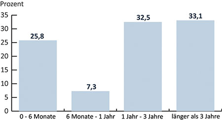 Die Mehrzahl der befragten Unternehmen (64,7%) verfügt bereits über ein PMO im Sinne dieser Studie. Allerdings sind in nur 33,1% dieser Unternehmen die PMOs länger als 3 Jahre etabliert (Bilder 5 und 6).