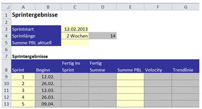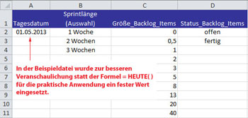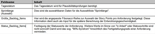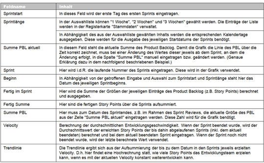 In der Registerkarte "Stammdaten" werden die grundlegenden Informationen für die Inhalte und Berechnungen in den Registerkarten "Backlog" und "Sprintergebnisse" hinterlegt (Bild 1 und Tabelle 1).