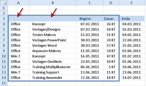- Markieren Sie die Spalten für die Projekt- und Phasenbezeichnungen sowie die für Beginn und Dauer einschließlich der Spaltenüberschriften. Im vorliegenden Beispiel ist dies also der Bereich A3:D14.