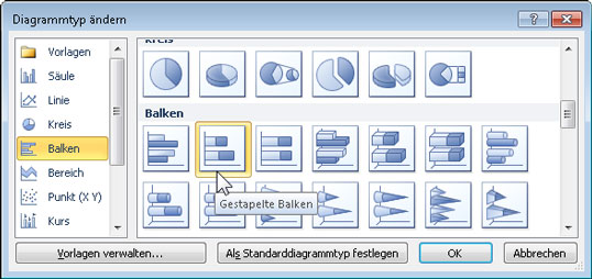 - Wählen Sie im folgenden Dialogfeld links den Typ Balken und rechts den Untertyp Gestapelte Balken.