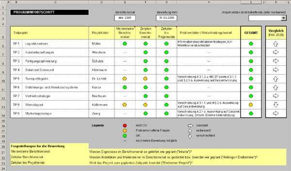 Bild 1: Beispiel für den Aufbau des Projekt-Cockpits für die laufende Bewertung des Projektforschritts.
