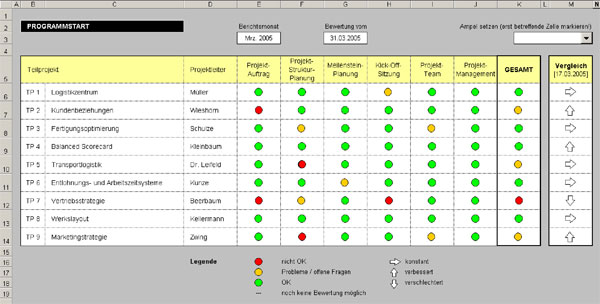 Sie sind für das Programmmanagement verantwortlich und benötigen für die Geschäftsleitung eine aussagekräftige Darstellung der Projektentwicklung? Oder Sie möchten den Projektleitern Feedback zum Status ihrer Projekte geben? In jedem Fall benötigen Sie eine Möglichkeit, um das Portfolio der aktuellen Projekte in regelmäßigem Abstand zusammenzuführen und zu bewertet. Die hier beschriebene Excel-Lösung zum Aufbau eines "Projekt-Cockpits" kann Ihnen dabei gute Dienste leisten. Sie ist flexibel einsetzbar und bietet eine grafisch übersichtliche Darstellung des Projektgeschehens. Der jeweilige Projektstatus wird durch Ampelsymbole signalisiert, die sich bequem per Dropdown ändern lassen (Bild 1).