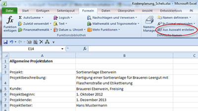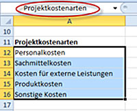 Alle globalen Parameter, die in den einzelnen Tabellen in Formeln, Textfeldern oder Grafiken verwendet werden, sind im Projektdatenblatt hinterlegt. Dazu gehören zum Beispiel das Datum des Projektbeginns, der Name des Projektleiters, die Kostenstelle, der Projektname und der Auftraggeber oder Kunde (Bild 3). Diese Werte werden nur einmal für das gesamte Projekt definiert. Ändern sich diese Werte, sollte sich das automatisch auf die gesamte Projektplanung und -auswertung auswirken. Das lässt sich am einfachsten mit globalen Bereichsnamen erreichen. Das Projektdatenblatt in unserem Beispiel ist in die Bereiche "Allgemeine Projektdaten", "Kostenarten" und "Monate" unterteilt.