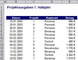 Bild 1 zeigt eine Liste, in der Zeile für Zeile jede Ausgabe notiert wird, und zwar für mehrere Projekte. Im vorliegenden Fall enthält die Liste nur vier Spalten mit den Angaben Datum, Projektnummer, Kostenart und Betrag. Die Liste lässt sich um beliebig viele andere Informationen in zusätzlichen Spalten erweitern - beispielsweise um den Namen der Abteilung, des zuständigen Mitarbeiters usw. Die hier beschriebene Liste finden Sie in der Musterdatei Projektkosten_0.xls. Sie ist dafür gedacht, den hier beschriebenen Lösungsweg Schritt für Schritt nachzuvollziehen.