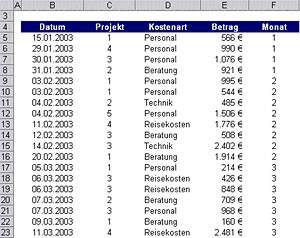 Bild 2: Ausschnitt der auszuwertenden Liste mit Projektkosten.