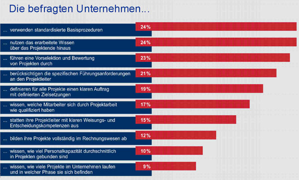 Wenn man die Ergebnisse in Bild 1 betrachtet, lässt sich insbesondere aus den beiden Faktoren mit den schlechtesten Werten schließen, dass vielen Unternehmen die Bedeutung der Projektarbeit noch nicht bewusst ist.