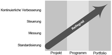 Die Stufen bauen von links unten nach rechts oben aufeinander auf (Bild 2). In jedem Wissensgebiet kann sich ein Unternehmen innerhalb der Bereiche auf unterschiedlichen Stufen bewegen. Ein Beispiel: Die ABC GmbH befindet sich beim Thema "Terminplanentwicklung und -steuerung" in allen Bereichen (Projekt, Programm, Portfolio) auf der Reifegradstufe "Steuerung". Im Risikomanagement erreicht das Unternehmen aber noch nicht einmal die Standardisierungsstufe im Bereich "Projekt".