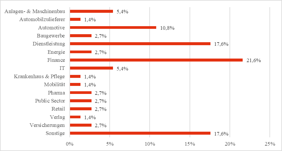 Um möglichst aussagekräftige Ergebnisse zu erhalten, befragten wir 74 Personen aus mehreren Branchen (Bild 1), Unternehmen mit verschiedenen Größen (Bild 2) sowie unterschiedlichen Positionen.