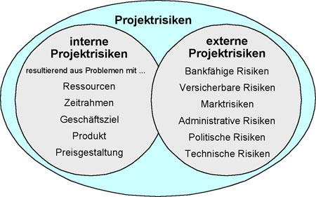 Projektrisiken können interner oder externer Natur sein (Bild 1). Während interne Risiken im Projekt selbst ihre Ursache haben und dort auch nachhaltig beseitigt werden können, liegen die Ursachen externer Risiken im Projektumfeld. Deshalb können Letztere häufig nicht oder nur teilweise ausgeschlossen werden. Es bleiben dann nur adäquate Vorsorgemaßnahmen. Je früher und genauer die spezifischen Risiken erkannt werden, um so größer sind die Chancen, sie in den Griff zu bekommen.