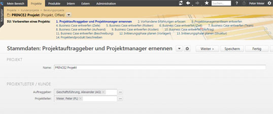 Standardmäßig unterstützt Projektron BCS verschiedene Projektmanagement-Vorgehensmodelle. So ist z.B. das Vorgehen nach PRINCE2 mit den entsprechenden Begrifflichkeiten und Zusammenhängen in einem Assistenten hinterlegt. Dieser führt den Anwender Schritt für Schritt durch den Planungsprozess, um die erforderlichen Daten zu sammeln. Somit ist für jedes Projekt im Unternehmen ein konformes Vorgehen sichergestellt. Bild 1 zeigt beispielhaft einen solchen Schritt innerhalb eines Vorgehensmodells. Hier wird die PRINCE2-Phase "SU" (Starting up a project) in die einzelnen Schritte zerlegt. Gezeigt ist die Festlegung der Verantwortlichkeiten (Auftraggeber und Projektleiter) als erster Schritt in der Phase.