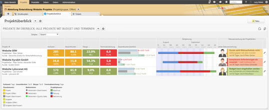 So lassen sich z.B. im CRM-Modul Kundenstammdaten verwalten und direkt mit Anfragen von Kunden zusammenführen. Um ein Angebot zu erstellen, kann der Kundenbetreuer unmittelbar aus dem CRM-Modul heraus ein Projekt initiieren und planen. Nach Zuordnung der entsprechenden Ressourcen lassen sich anhand der hinterlegten Kostenstrukturen die Gesamtkosten ermitteln und diese direkt in das Angebot übernehmen.