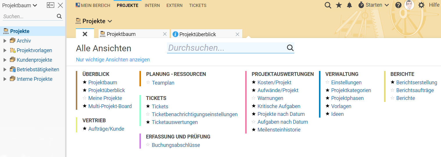 Je nach Benutzerrolle kann die Auswahlliste mit den verfügbaren Ansichten recht umfangreich sein (Bild 1). Häufig verwendete Ansichten lassen sich mit einem Sternchen als Favoriten markieren, was die Auswahl im Arbeitsalltag beschleunigt. Wer regelmäßig mit BCS arbeitet, wird sich schnell in den Ansichten zurechtfinden. Für die gelegentliche Nutzung gibt es Assistenten. Ein solcher Assistent führt z.B. durch die einzelnen Schritte zum Anlegen eines Projekts.