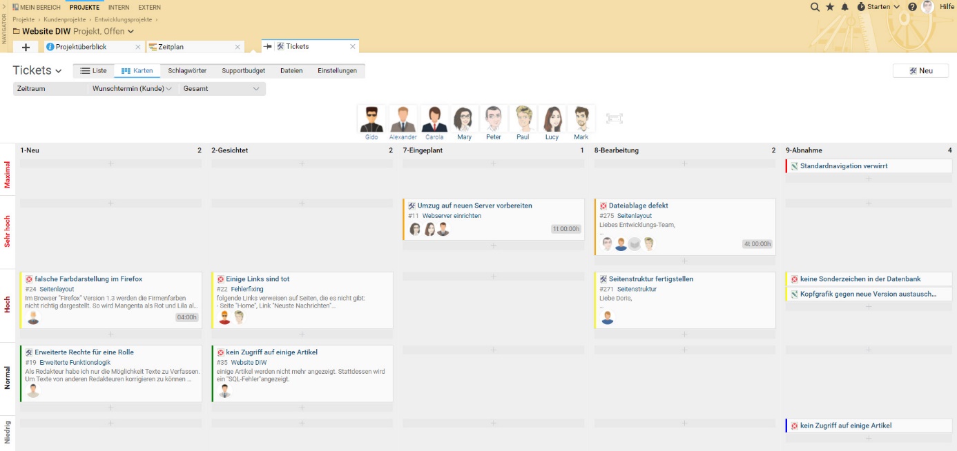 Die verschiedenen Arbeitsbereiche finden sich in der Kopfzeile des Programmfensters, etwa der Bereich "Projekte" für die Projektplanung und -steuerung, der Bereich "Intern" für die Verwaltung des eigenen Teams und "Mein Bereich" mit der persönlichen Übersicht für jedes Teammitglied. Jeder Bereich bietet mehrere Ansichten. Unter "Projekte" finden sich z.B. Ansichten für die Projektstammdaten, den Strukturplan, den Teamplan und den Projektplan mit einer Gantt-Terminansicht. Über die Navigationsleiste am linken Fensterrand ist ein schneller Wechsel zwischen verschiedenen Planungsobjekten möglich, wobei die vorher gewählte Ansicht beim Wechsel erhalten bleibt. So springt man z.B. schnell durch die Teamansicht für die diversen Arbeitspakete im Projekt.