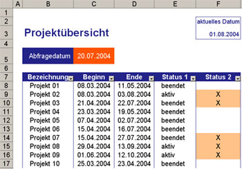 Bild 1 zeigt eine Projektliste mit Start- und Ende-Datum. In der Spalte "Status 1" wird tagesaktuell angezeigt, ob das Projekt noch aktiv oder bereits beendet ist. In der Spalte "Status 2" werden all jene Projekte mit einem Kreuz versehen, die zu einem bestimmten Zeitpunkt (Stichdatum) aktiv waren. Hier lassen sich also Statusabfragen für bereits vergangene oder auch für künftige Termine stellen.