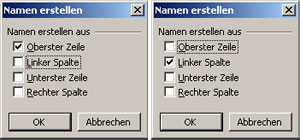 Um einen Namen für das Feld mit dem Abfragedatum zu vergeben, verfahren Sie analog mit dem Zellbereich B5:C5. Diesmal muss allerdings im Dialogfeld das Kontrollkästchen aus Linker Spalte mit einem Häkchen versehen sein (Bild 2 rechts).