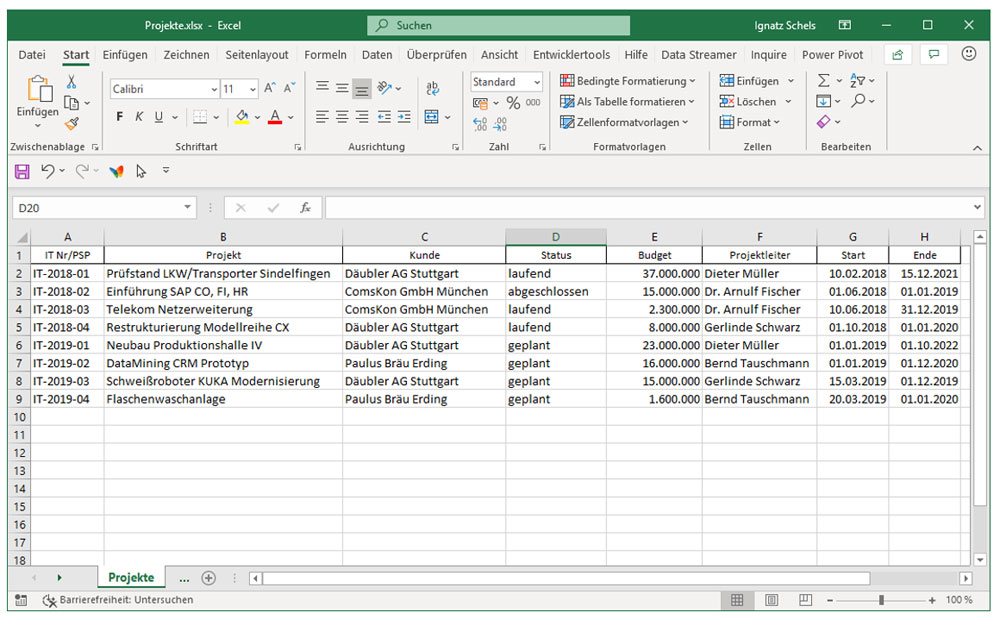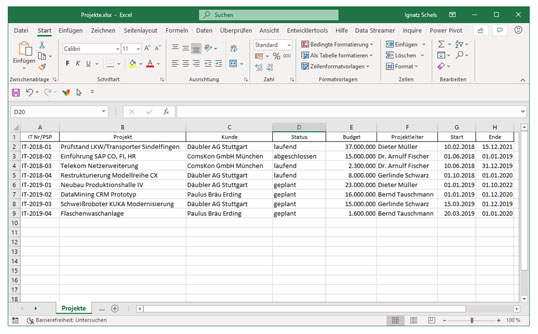 Um eine sichere Auswertung zu gewährleisten, sollte im zentralen Projektordner auch die aktuelle Projektliste bereitstehen. Die Liste kann als SAP-Exportdatei, als Tabelle oder Sicht (Abfrage) in einer Datenbank, als Excelliste oder -tabelle oder sogar als einfache Textdatei (am besten im CSV-Format) vorliegen. Entscheidend ist, dass sie ständig aktuell gehalten, d.h. regelmäßig aktualisiert wird. Bild 2 zeigt eine Projektaufstellung in Form einer Excel-Liste, angelegt im Tabellenblatt Projekte und gespeichert in der Arbeitsmappe F:\Projektmagazin\Projekte.xlsx.