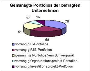 Von den Teilnehmern gaben 78 an, vorrangig IT-Portfolios zu managen, 58 F&E-Portfolios und 51 gemischte Portfolios, also Portfolios ohne einen expliziten Schwerpunkt. 17 Unternehmen betreiben vorrangig Organisationsprojekt-Portfolios, 16 Investitionsprojekt-Portfolios (Bild 2).