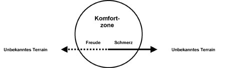 Der Mensch ist ein Gewohnheitstier. Veränderungen packt er nur unter zwei Voraussetzungen an: Schmerz oder Freude. Meist ist es der Schmerz, der uns dazu bewegt, unser Leben umzukrempeln - anders sehen wir keinen Grund, lieb gewonnene Pfade der Gewohnheit zu verlassen. "Komfortzone" (siehe Bild) nennen wir den Bereich, den wir nur verlassen, wenn Schmerz oder übergroße Freude uns dazu motivieren.