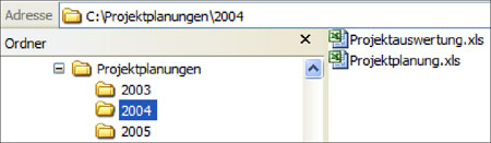 Gleich zu Beginn der Planung sollten Sie sich überlegen, welchen Speicherort Sie für Ihre Dateien wählen. Damit die Verknüpfungen korrekt funktionieren, müssen "Projektplanung.xls" und die Datei "Projektauswertung.xls", dieim zweiten Teil dieser Artikelfolge vorgestellt wird, im gleichen Verzeichnis liegen. Excel findet auf diese Weise automatisch das jeweilige Gegenstück. Zur besseren Übersicht bietet sich eine Verzeichnisstruktur wie in Bild 1 an, die der jährlichen Planung entspricht. Wenn der Speicherort auf einem Netzwerkserver liegt, sollten alle Projektmitarbeiter zumindest Leserechte darauf haben.