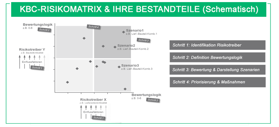 KBC hat eine Methode entwickelt, die diesen Herausforderungen gerecht wird. Sie setzt sich aus vier aufeinander aufbauenden Schritten zusammen und ist auf verschiedenste Anwendungsfälle übertragbar. Die Herangehensweise wird im Folgenden Schritt für Schritt generisch sowie anhand des konkreten Fallbeispiels mit dem Automotive-OEM beschrieben. Das Ergebnis ist eine Risikomatrix, welche sowohl die Lieferanten- als auch die entsprechende Bauteilkritikalität abbildet.