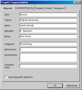 Über Datei / Neu / Leeres Projekt erhalten Sie einen neuen Arbeitsbereich und können damit beginnen, ein neues Projekt anzulegen. Es ist sinnvoll, als Erstes die Daten zum Projekt einzugeben. Dies geschieht einmal unter Datei / Eigenschaften, wo Sie den Titel des Projekts angeben können (bleibt das Feld leer, verwendet Project den Dateinamen), einen Untertitel (kann auch eine Projektnummer sein) und andere, sich selbst erklärende Infos eintragen können (Bild 1). Diese Informationen gehören zum Projekt und man kann beim Drucken angeben, dass sie als Kopf- oder Fußzeile oder in der Legende ausgedruckt werden.