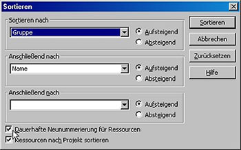 Die Nummer der Ressource wird automatisch vergeben. Da die Ressourcen beim Zuordnen in der Reihenfolge ihrer Nummerierung gelistet werden, erleichtert eine sinnvolle Nummerierung die Arbeit. Man kann die Liste z.B. nach Namen sortieren (Projekt / Sortieren / Sortieren nach) oder zunächst nach der Gruppe und anschließend nach dem Namen (Bild 2). Wenn Sie im Dialog "Sortieren" bei "Dauerhafte Neunummerierung für Ressourcen" ein Häkchensetzen,wird die Nummerierung entsprechend der neuen Reihenfolge angepasst.