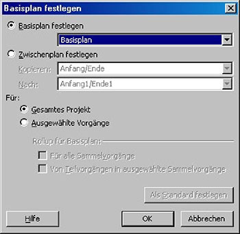 Der Basisplan für das Gesamte Projekt oder für Ausgewählte Vorgänge kann über den Menüpunkt Extras / Überwachung / Basisplan festlegen (in Project 2003: / Basisplan speichern) festgelegt werden.