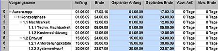 In der Tabelle "Abweichung" (Ansicht / Tabelle: ... / Abweichung) werden Anfang und Ende, Geplanter Anfang und Geplantes Ende sowie Abweichung Anfang und Abweichung Ende angezeigt (Bild 2). In der Tabelle"Arbeit"sieht man entsprechend die Arbeit, die Geplante Arbeit und die Abweichung Arbeit, in der Tabelle "Kosten" die analogen Kostenfelder.