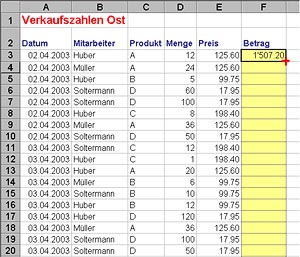 Haben Sie eine lange Liste und möchten die eben erstellte Formel blitzschnell über Tausende von Zeilen kopieren? Bislang haben Sie wahrscheinlich Ihre Formel mit dem Ziehpunkt an der Zelle nach unten gezogen. Probieren Sie nun einmal einen Doppelklick auf den Ziehpunkt (Bild 1). Die Formel wird dadurch automatisch so lange nach unten kopiert, bis links von ihr eine Leerzelle erscheint. Das bedeutet: Ist die Tabelle durchgängig ausgefüllt, wird die Formel bis ans Ende der Liste kopiert.