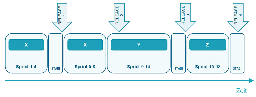 Die Änderungen in den Sprints 9 bis 14 waren recht kompliziert, so dass wir danach eine separate Testphase vor dem Release vorsahen. Deswegen verzichteten wir darauf, direkt nach Sprint 14 weiterzuarbeiten und führten stattdessen einen Stabilisierungssprint durch. Den Abschluss des Projekts bildete das Release 4, in welchem wir die Änderungen der Sprints 15 bis 18 produktiv setzten.