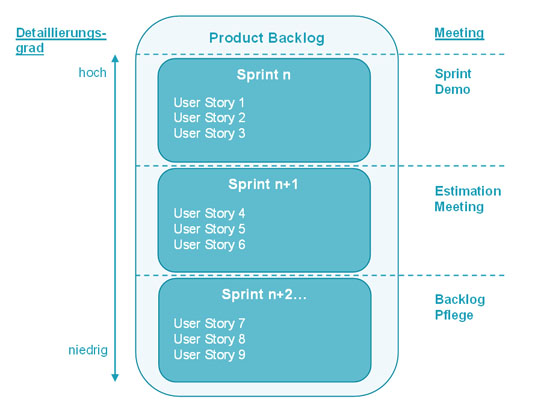 Verglichen mit dem Wasserfallmodell wird in Scrum das Lastenheft während der Projektarbeit "just-in-time" generiert. Vor Beginn jedes Sprints müssen ausreichend User Storys vorliegen, die bereit sind für die Implementierung – mindestens jedoch für einen Sprint. Anzustreben ist ein Vorrat für zwei bis drei Sprints. Die Arbeit mit User Storys verlangte sowohl bei der Konzeption als auch bei der Realisierung kurzfristiges Feedback von den Fachbereichsvertretern.