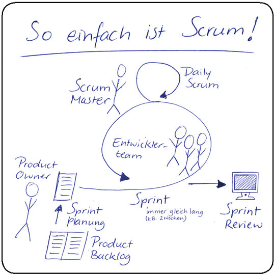 Bei Scrum geht es darum, iterativ und inkrementell Software zu entwickeln (obwohl man Scrum im Prinzip auch für andere Zwecke verwenden kann, z.B. für die Planung einer Hochzeit). Entscheidend sind dabei die kurzen Feedback-Zyklen: Es werden neue, kleine funktionsfähige Häppchen (Inkremente) der Software erstellt und begutachtet (im besten Fall sogar gleich produktiv gestellt). Das Feedback, das man zu den letzten Inkrementen bekommt, geht dann in die weitere Entwicklung mit ein. Der Workflow von Scrum ist dabei so einfach gestaltet, dass er sogar auf einen Bierdeckel passt (Bild 1).