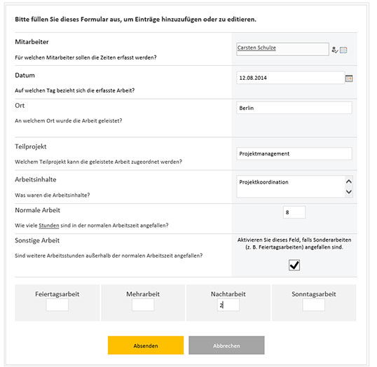 Bild 1: Beispiel einer mit MS InfoPath angepassten Zeiterfassung.