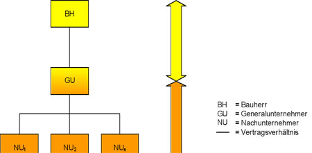 Bei großen Bauprojekten delegiert der Bauherr (BH) wesentliche Aufgaben an einen Generalunternehmer (GU). Dieser wiederum beauftragt verschiedene Nachunternehmer (NU) als Einzelunternehmer mit der Ausführung der Werkleistung und koordiniert deren Arbeiten. Im Schlüsselfertigbau wird dem GU häufig zusätzlich die Verantwortung für die Ausführungsplanung übertragen. Bei dieser Abwicklungsform ist er für die übergreifende Ausführungsplanung und Koordination zuständig, während die NU lediglich ihre vereinbarte Leistung erbringen müssen. In Bild 1 ist eine typische Projektorganisation stark vereinfacht dargestellt. Im Folgenden wird vorrangig das Verhältnis zwischen einem GU (Auftraggeber) und mehreren NU (Lieferanten) betrachtet.