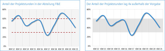 - Mit einem solchen Diagramm machen Sie nicht nur Abweichungen gut erkennbar, sondern können mit Hilfe der Linien oder Flächen die Grenzwerte schnell und flexibel verändern.