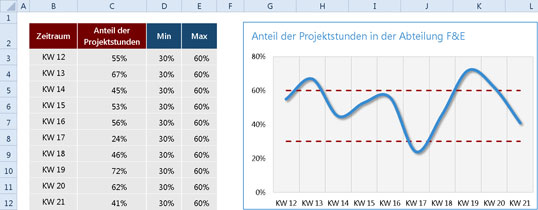 - In den Spalten B und C stehen die Daten für das Liniendiagramm, das den Anteil der Projektstunden in zehn Kalenderwochen darstellt. Daneben geben Sie in den Spalten D und E die Werte für die beiden Begrenzungslinien ein.