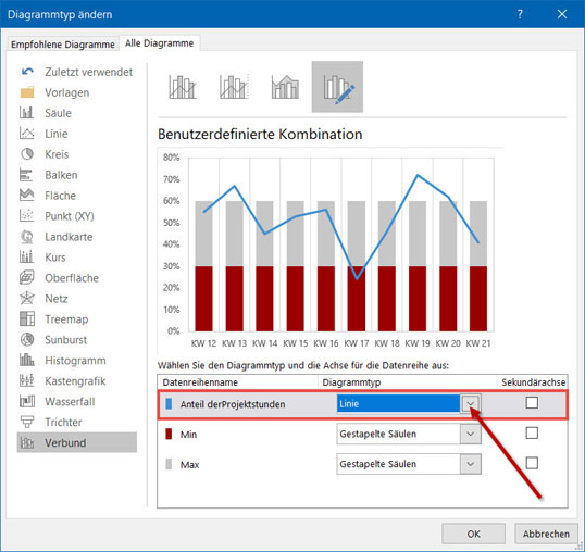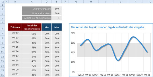 Zwischenfazit: Die Linie mit den Stundenanteilen für Projektarbeit ist gut im Diagramm zu sehen und auf einen Blick ist zu erkennen, in welchen Kalenderwochen der vorgegebene Wertekorridor verlassen wurde. Einen kleinen Nachteil hat die Lösung: Alle drei Linien reichen links und rechts nicht bis an den Rand.