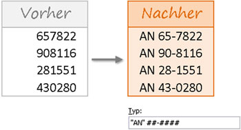 Die Zeichen, die vor oder nach einer Zahl als zusätzliche Information angezeigt werden sollen, setzen Sie in Anführungszeichen. Mit der Rauten-Anweisung ##-#### sorgen Sie für die gewünschte Zifferngruppierung.